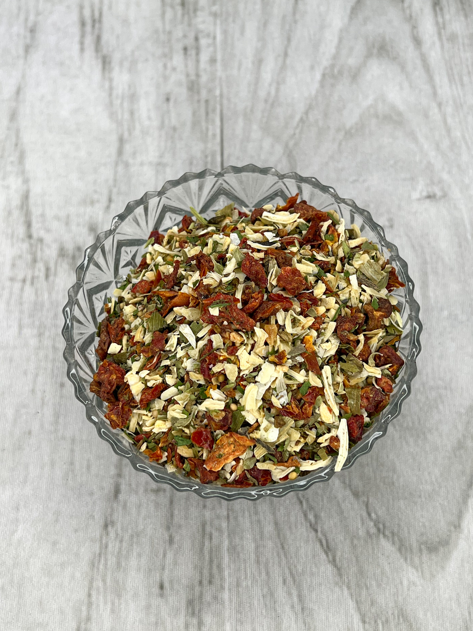 Ingredientes: Alho granulado, cebola granulada, ervas finas, orégano, pimentão verde, pimentão vermelho e tomate em flocos.