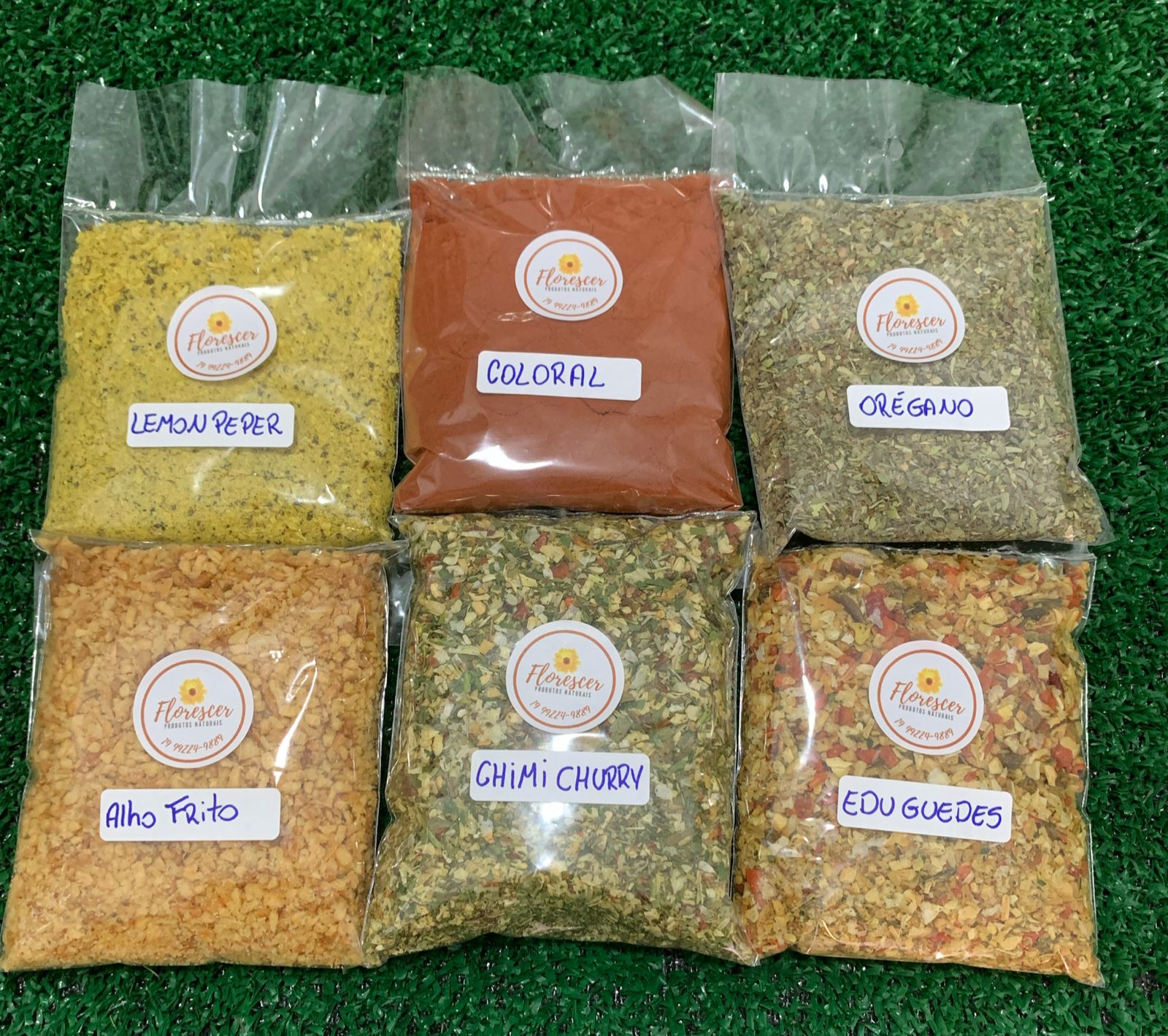 6 temperos essenciais 100g Chimi Churri, 100g Coloral, 100g Lemon Peper, 100g Alho Frito, 100g Edu Guedes, 30g Orégano